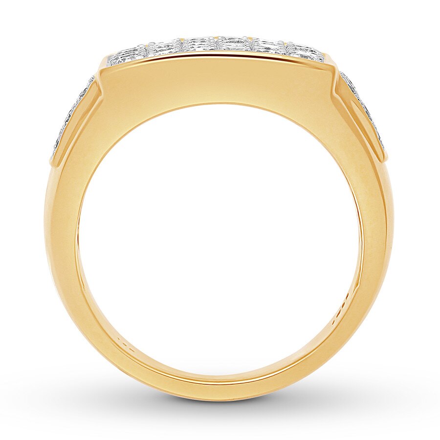 This outstanding men's band shines with a host of brilliant round diamonds in the center and even more diamonds on the band. Crafted of 10K yellow gold, the ring has an impressive total diamond weight of 2 carats.